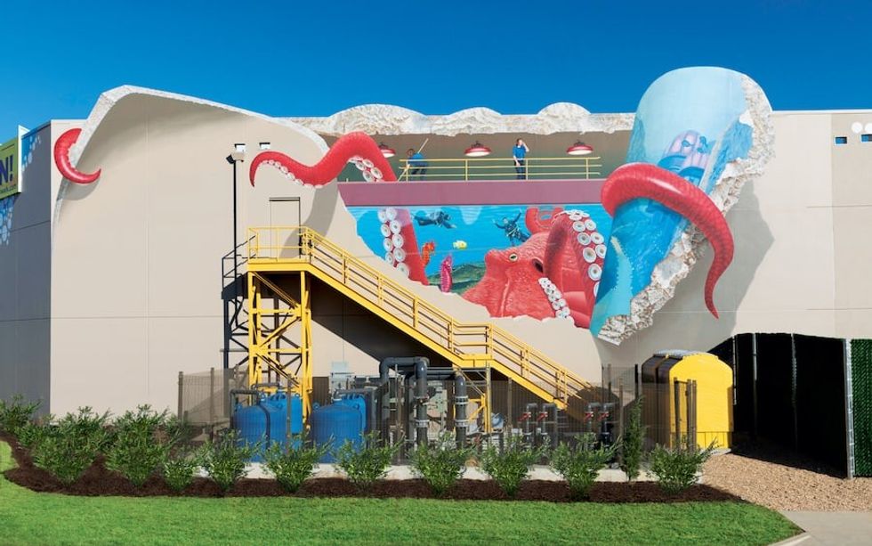 The exterior of the aquarium is striking: a wave, surmounted with a 55-foot stainless steel octopus.