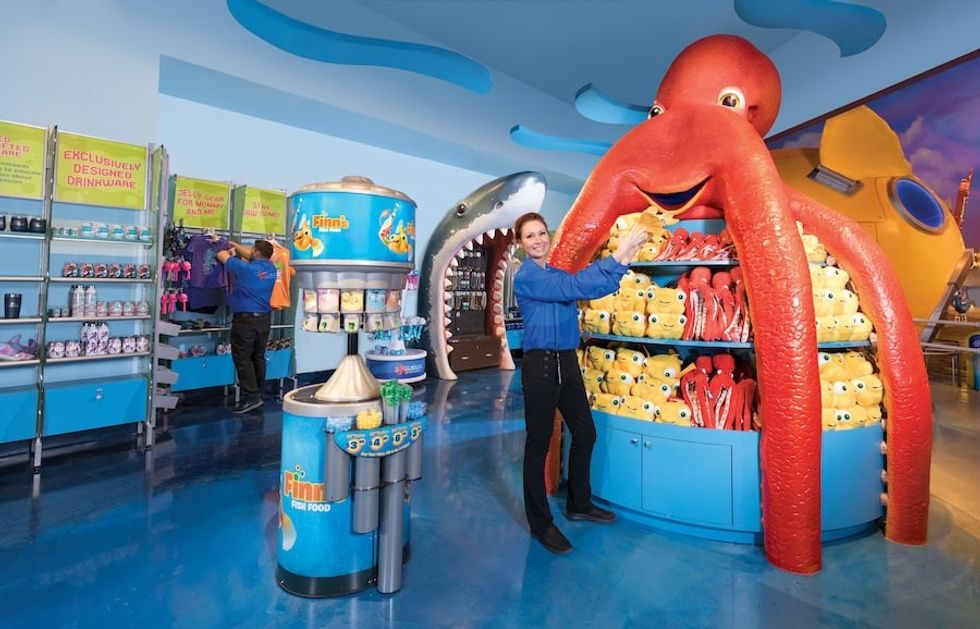 Inside, the lobby is themed as a boardwalk. Here, visitors buy their tickets and are greeted by the key characters, Aquarius the octopus, and Finn, a puffer-fish.