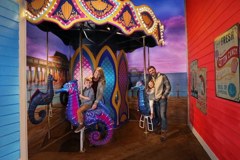 The boardwalk theme is continued through lenticular amusements such as The Great Clambino, who tells fortunes and the "Pucker" Fish kissing booth. There is also a carousel photo op, with seahorses instead of horses.