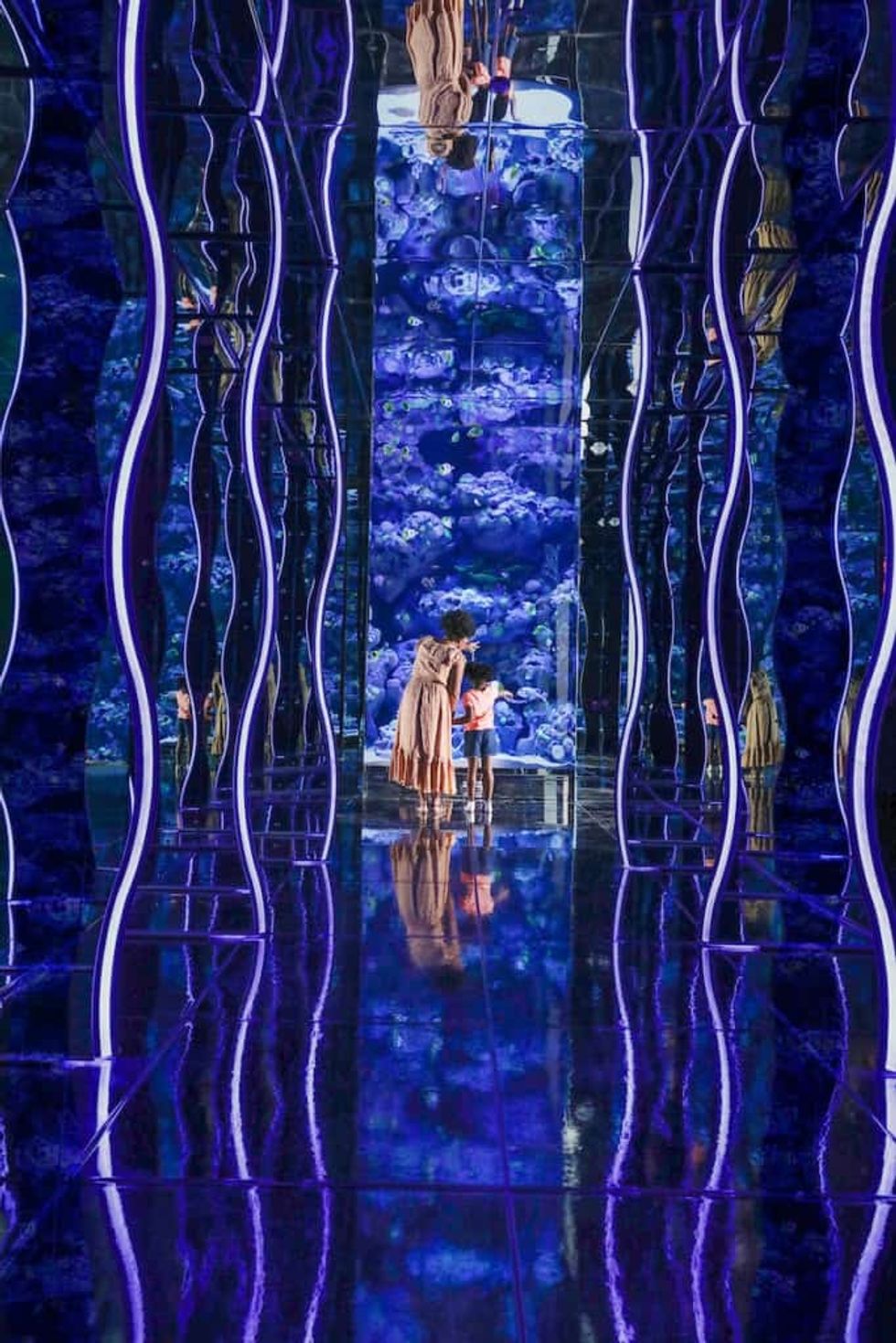 The next environment at Aquarium at the Boardwalk, the Bloom Room, celebrates jellyfish; specifically moon jellies. Here, the animals are showcased in tube tanks surrounded by mirrors and lights in a maze-type art installation comprising light-up tentacles through which the visitors pass, and a mirror maze: