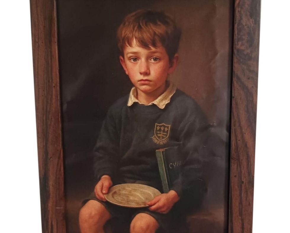 The artwork, titled Empty Plate (2024), depicts a young boy wearing school uniform and holding a plate. It was generated using AI before being printed.