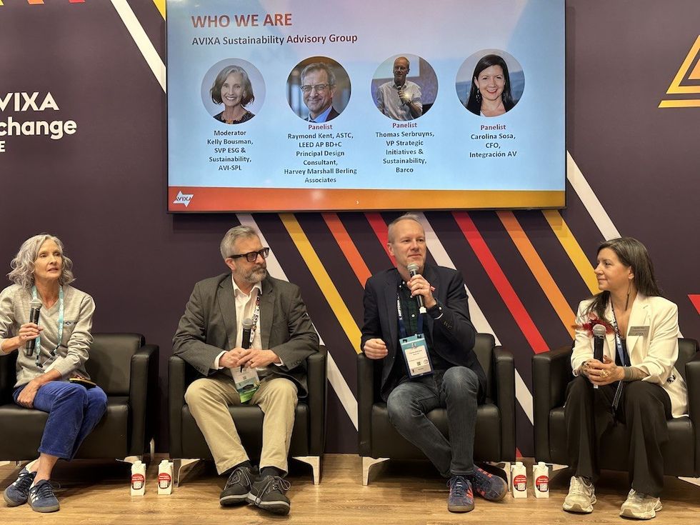 Moderated within the framework of the AVIXA Sustainability Advisory Group, the panel featured Thomas Serbruyns, vice president of strategy and sustainability at Barco, alongside Carolina Sosa of Integración AV and Ray Kent of Harvey Marshall Berling Associates. It was chaired by Kelly Bousman from AVI-SPL.