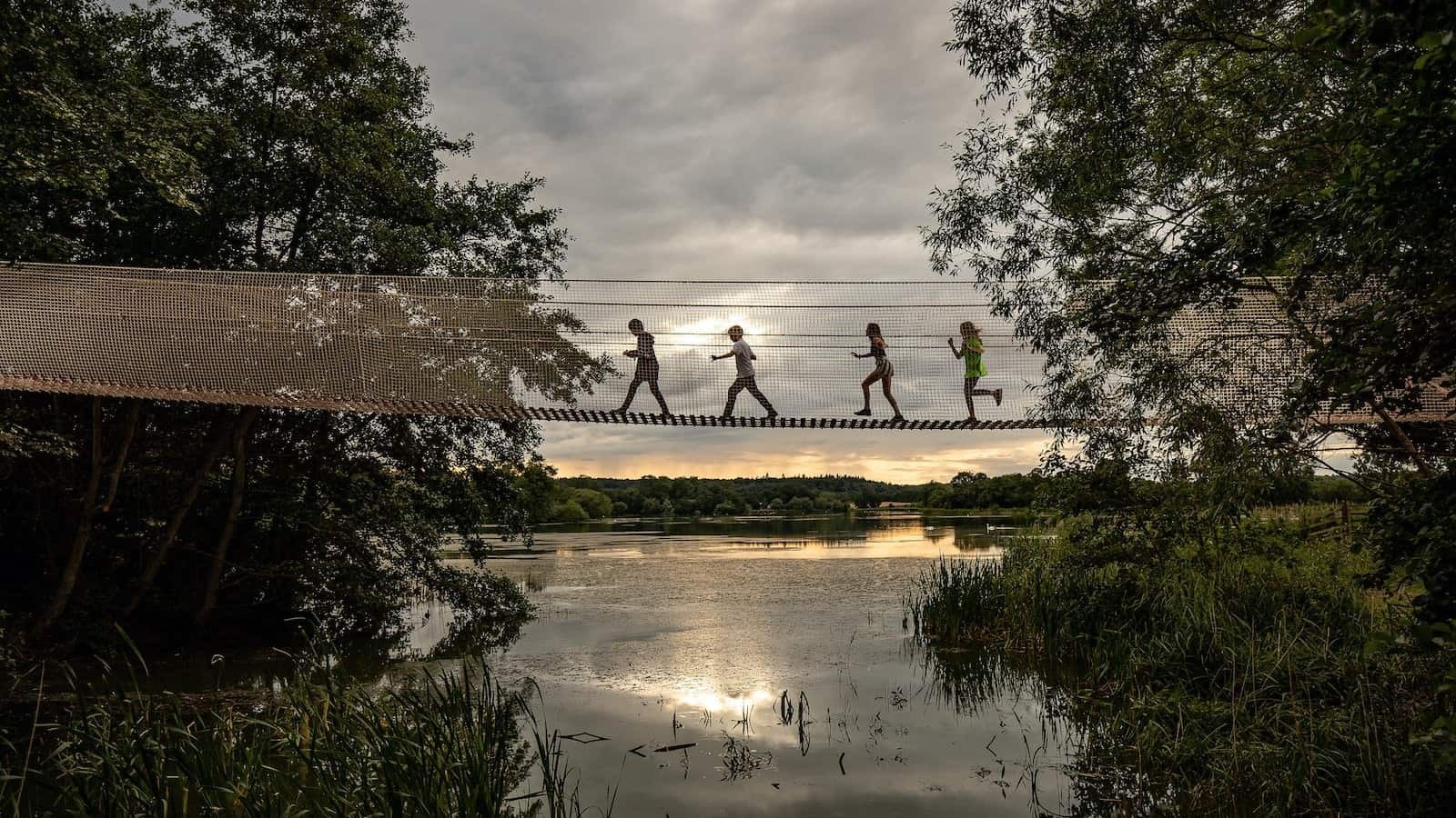 children on a rope bridge at sunset, at Skelf Island, Castle Howard