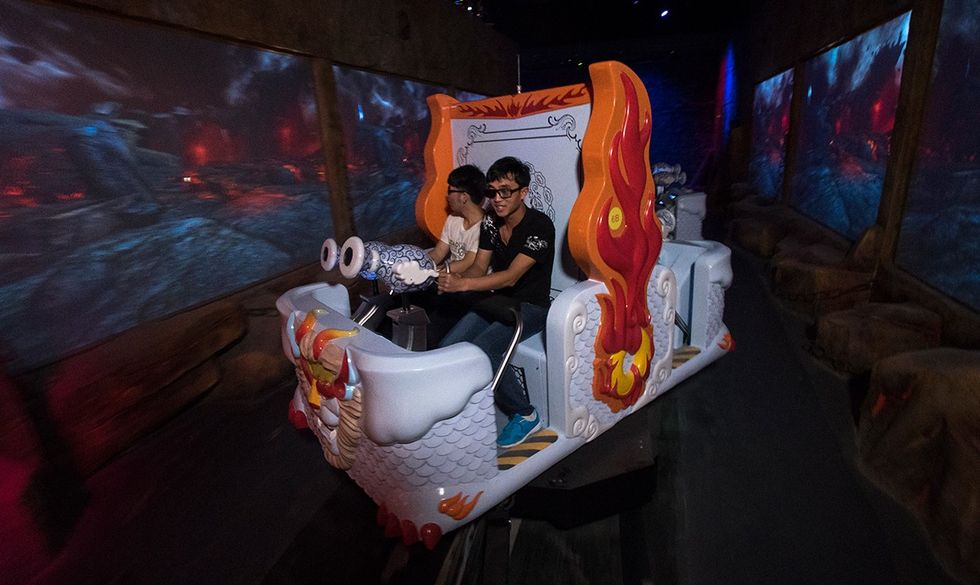In the indoor part we’ve built a great 3D dark ride, called “Chung Kuei Is Marrying-Off His Sister”. The ride and the game are based on a Chinese legend, where Chung Kuei (the ‘Demon Queller’) is marrying-off his sister! Both adults and children enjoy a great gaming experience while riding through the various game scenes. The interactive part offers an extra dimension to a traditional dark ride. The game has an unprecedented high quality. Visitors are challenged to defeat little monsters and demons during the various game scenes: in a house, a valley, flying through the sky, swimming under water and much more!