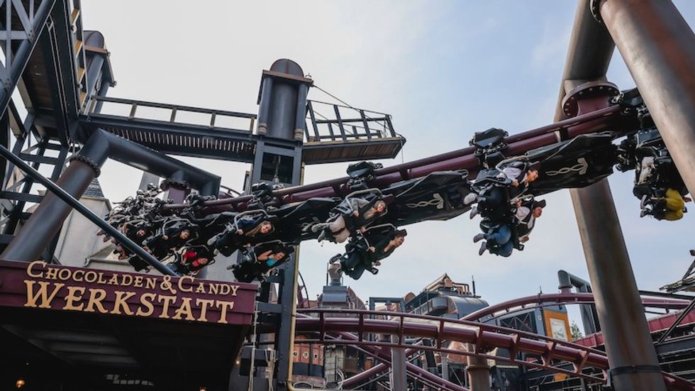 On this really unique ride, riders are comfortably and safely harnessed in a prone position. Riders start in a sit-down position and are transported sideways to a dark ride section. They are immersed in a story to save the world using their flying super powers.
