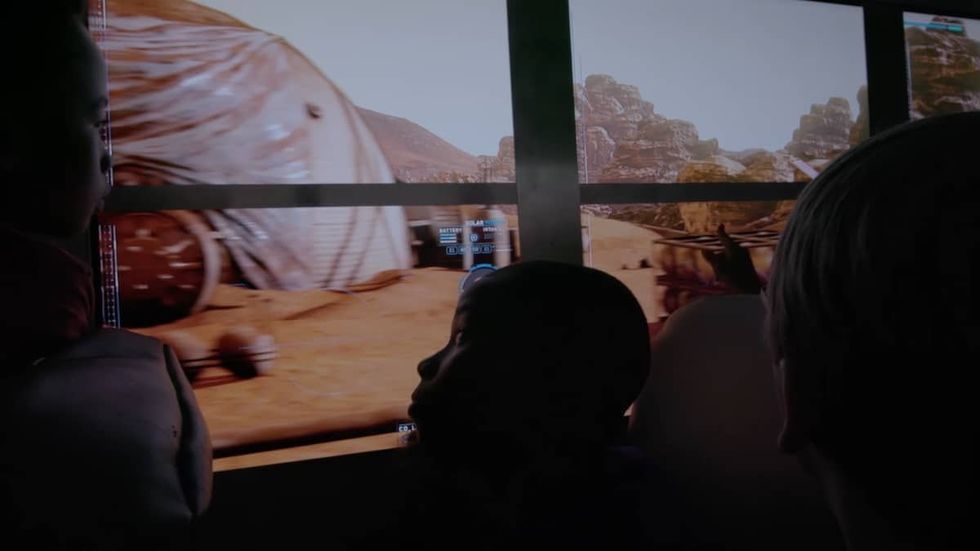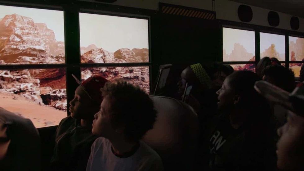 Framestore created a 200-square-mile ‘worldspace’ based on the real street configurations of D.C. The team programmatically covered the area with geological features and painted objects along the bus’s route, and created a system that would allow real bus speed, GPS and accelerometer to be translated into Unreal, creating a real school bus that would exist inside the realm of a video game. The bus itself became the headset: transparent 4K screens enabled passengers to look outside to D.C., before being transported to the rocky terrain of Mars.