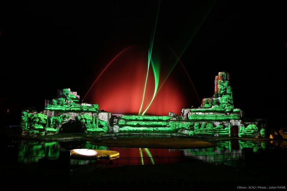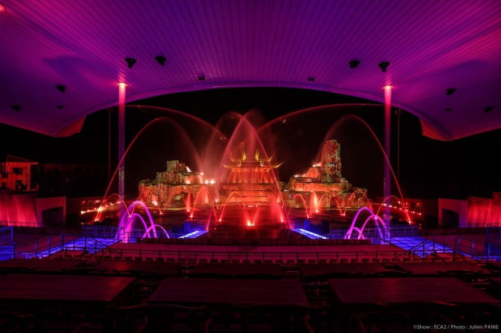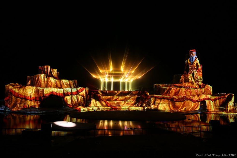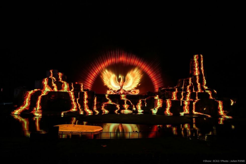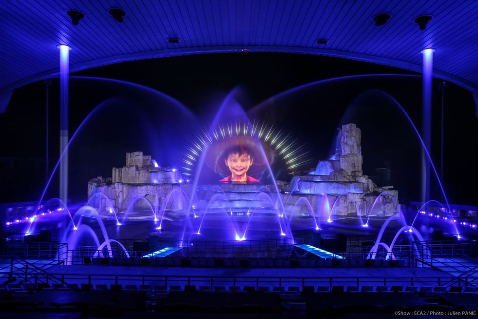 A triumph over technical challenges: special effects gadgetry concealed within a cantilever roof, a complex video mapping because of the irregular 3D shapes of the set, a 10, 000 cubic metres per hour of water perfectly controlled to protect technical equipment, an incredible 50 meters wide water screen and fireworks launched from a water-drenched set, 90 performers on a stage 70 meters wide & 25 meters high. 48 minutes of immersive experience!