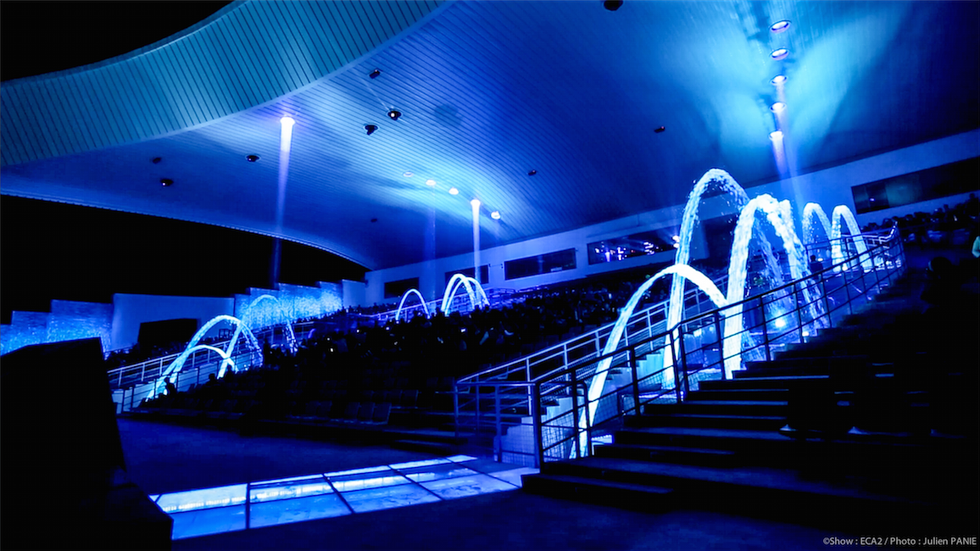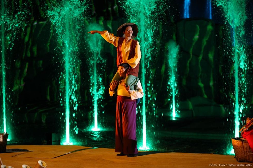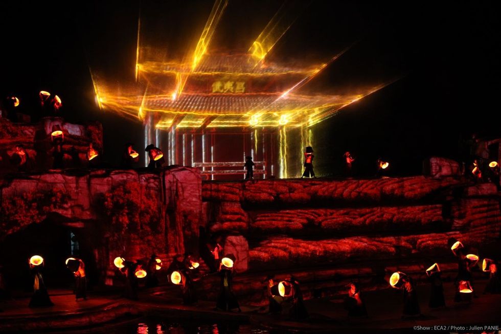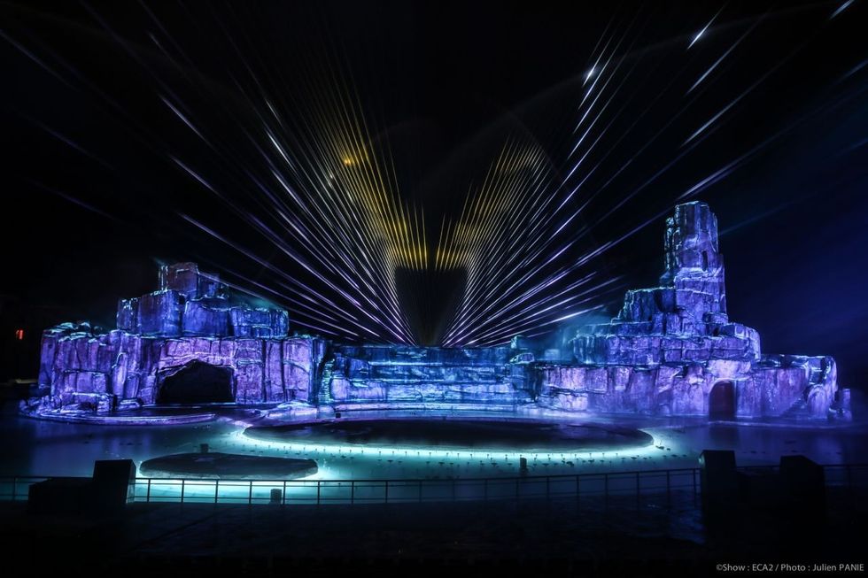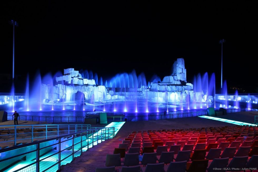 A triumph over technical challenges: special effects gadgetry concealed within a cantilever roof, a complex video mapping because of the irregular 3D shapes of the set, a 10, 000 cubic metres per hour of water perfectly controlled to protect technical equipment, an incredible 50 meters wide water screen and fireworks launched from a water-drenched set, 90 performers on a stage 70 meters wide & 25 meters high. 48 minutes of immersive experience!