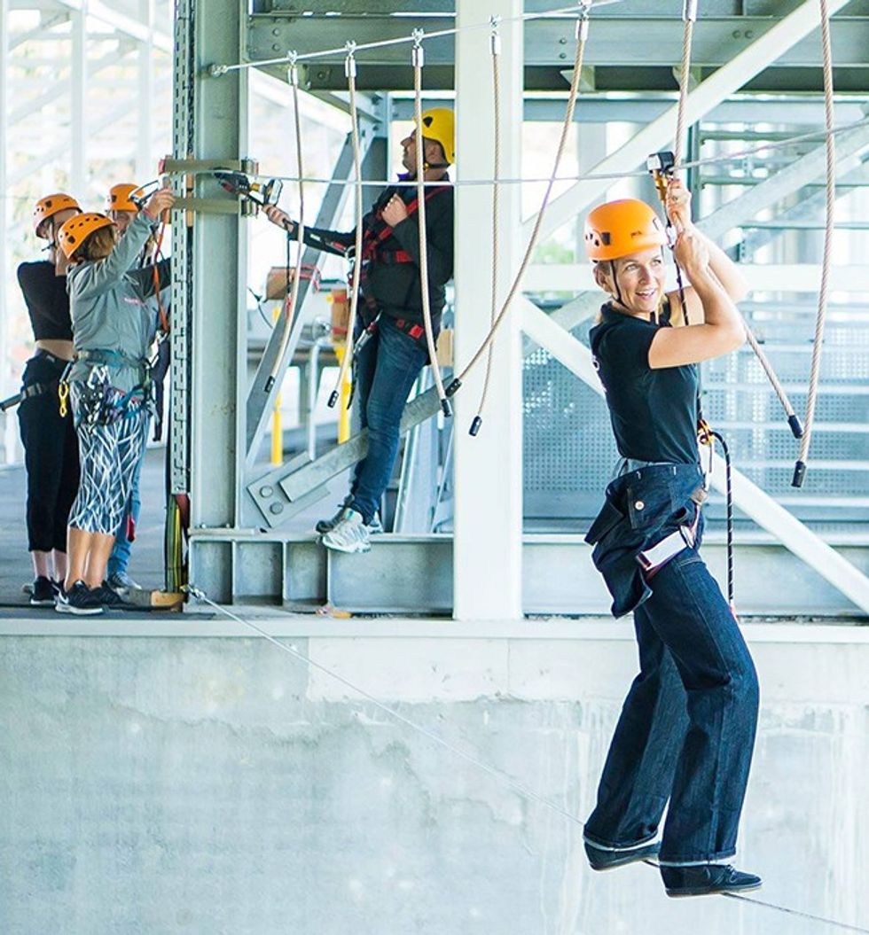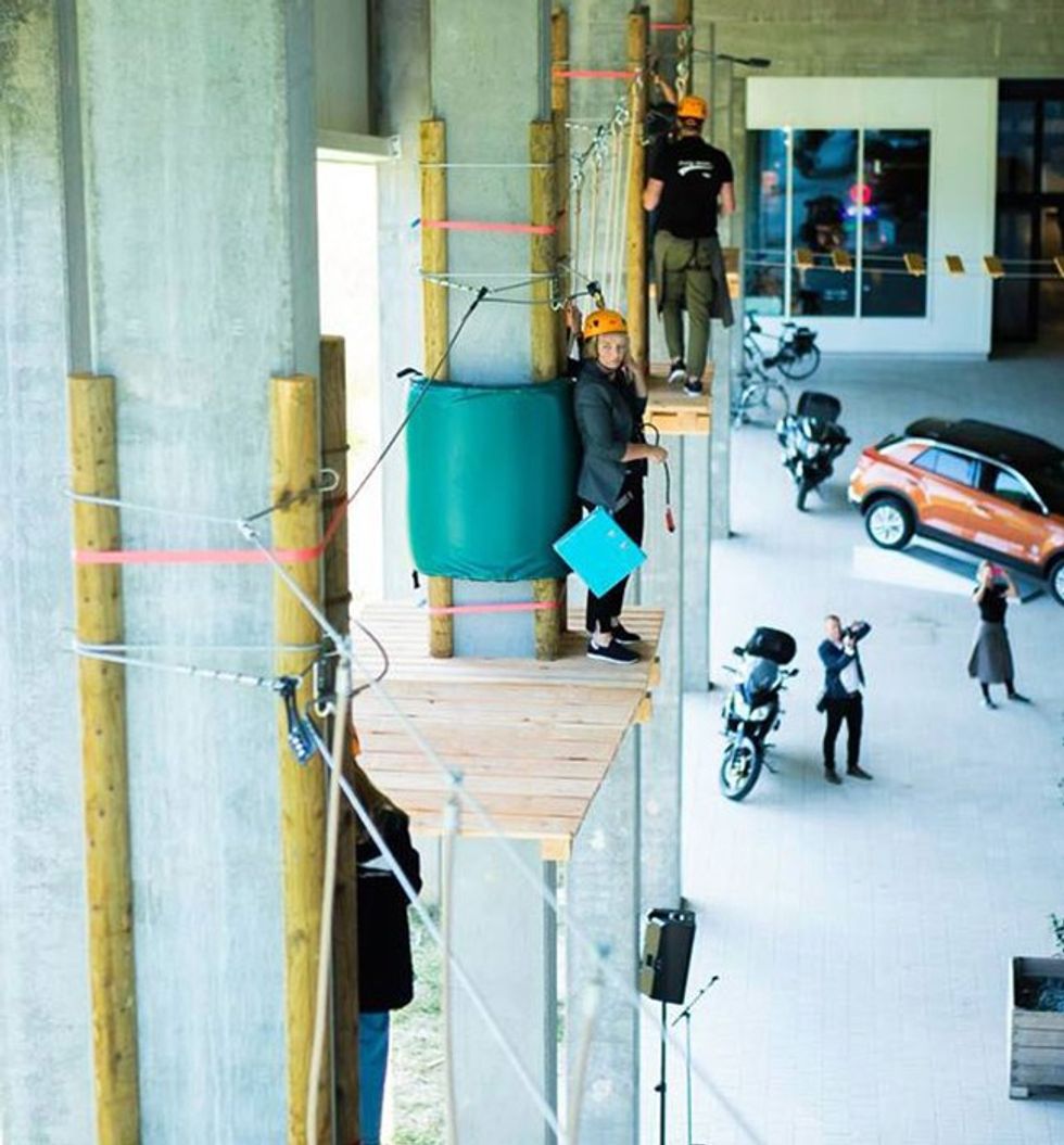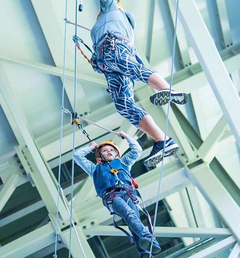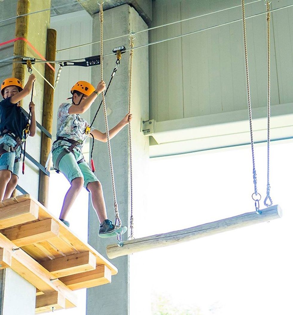 NEW High Ropes Course in Aspen, Wilrijk, Antwerpen, opened September, 2018. This indoor aerial adventure, installed on poles, features a single course with 10 obstacles hanging 6 meters above ground. It includes the “Death Ride” and “Snowboard on Wheels”, securely saved with Saferoller® continuous belay system.