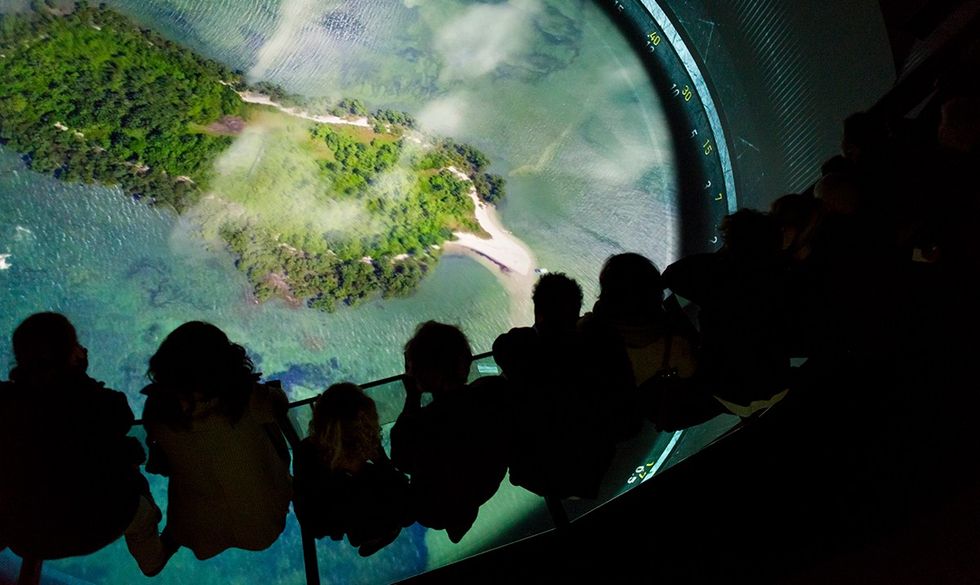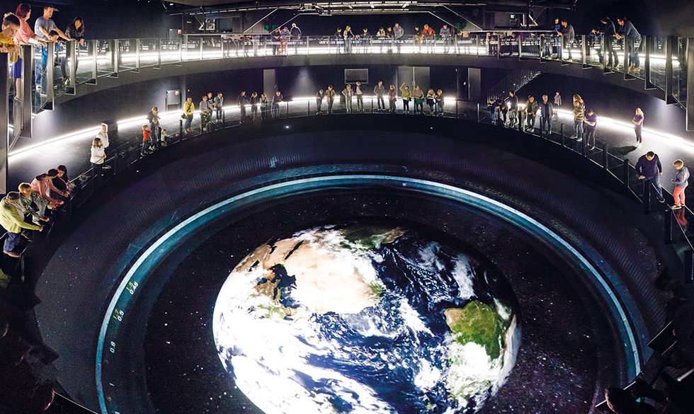 This space boasts a fantastic 360 degree projection, combined with a floor projection for a unique look at our world. Visitors can literally look down on the earth from two separate rings placed at high altitude. The floor projection spans 18 meters in diameter, while two high-end Barco 4k projectors with 35,000 lumens maintain its optimal resolution. The wall projection stands at 6 meters high. Seven Barco projectors with 14,000 lumens form the 360 degree projection. Multi-display software by Watch-out, which allows 'edge blending' and 'warping', is used to distribute video.