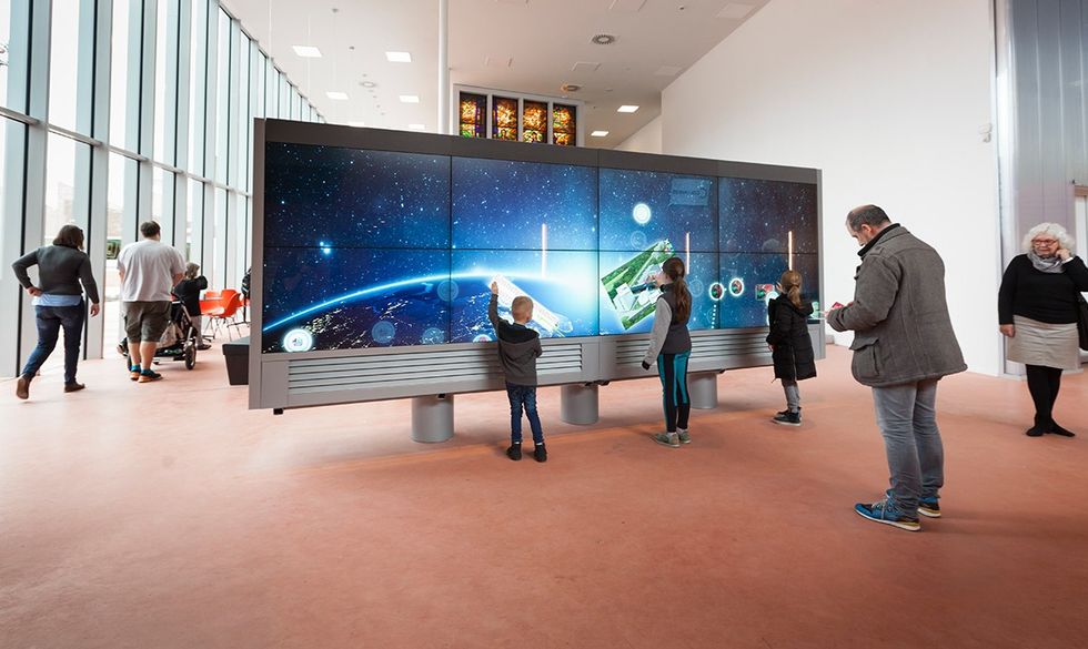 We wanted to create something special for Museumplein Limburg's entrance. Therefore, we installed a very large touch-wall measuring 1.5 x 5 meters with a resolution of 7680 x 2160 pixels. Ten people can simultaneously use the wall, which is also equipped with an audio system. On the other side, a video wall with the same high resolution can be used to give presentations or play informational videos. Seating is available for visitors in a gallery/staircase located in front of the video wall.
