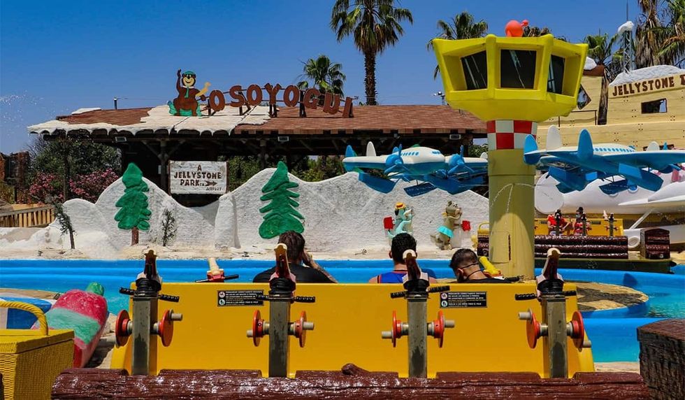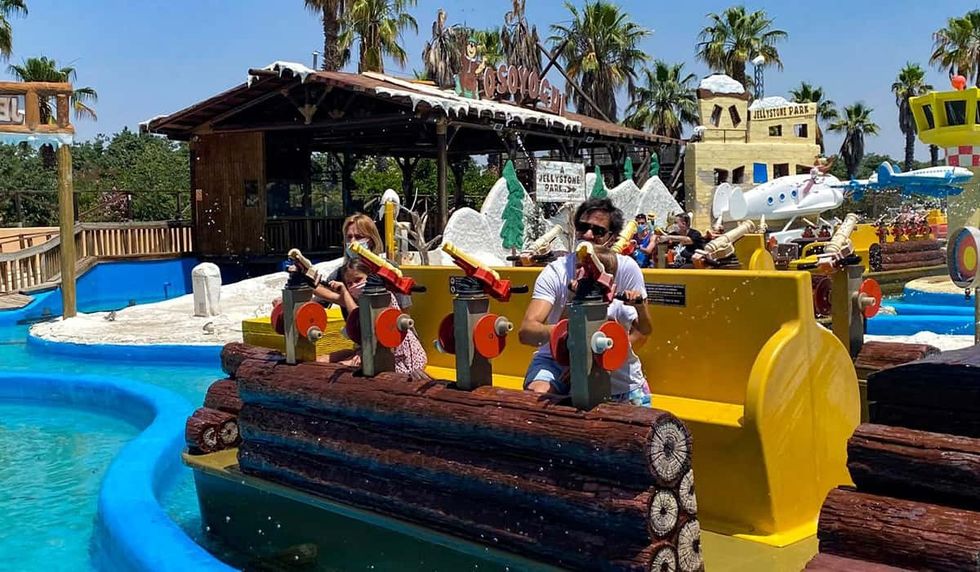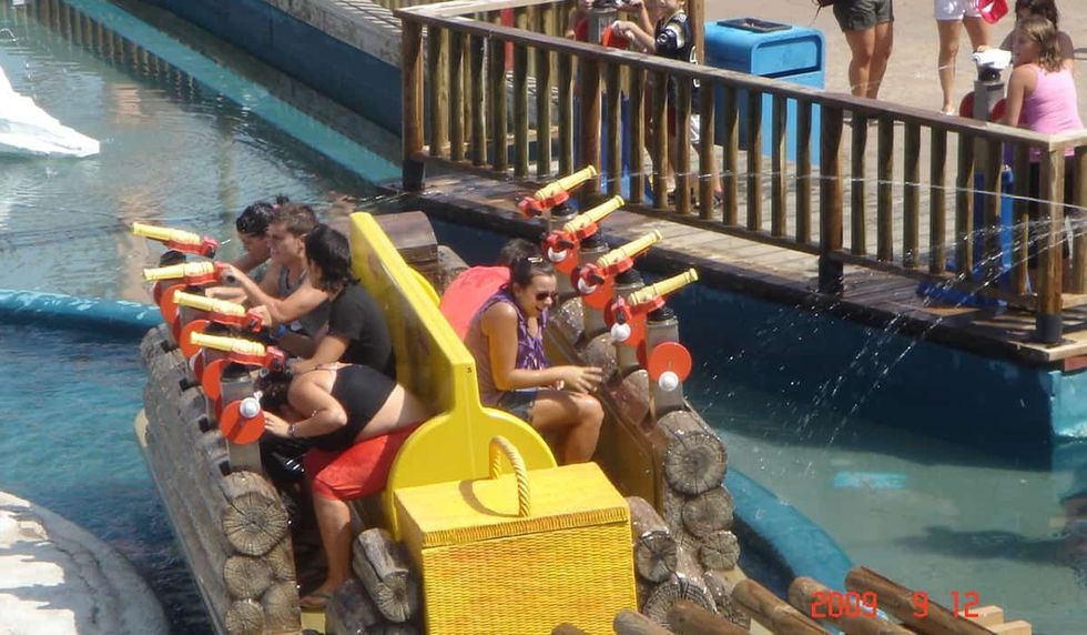 Boats leave the station and are transported along the channel by the water current. Each boat has a back-to-back seating arrangement and is equipped with a water cannon for each guest. The aim for guests is to squirt as much water at neighbouring boats passing by, along with spectators watching around the ride, while they try their best to avoid the direct fire from other cannons.