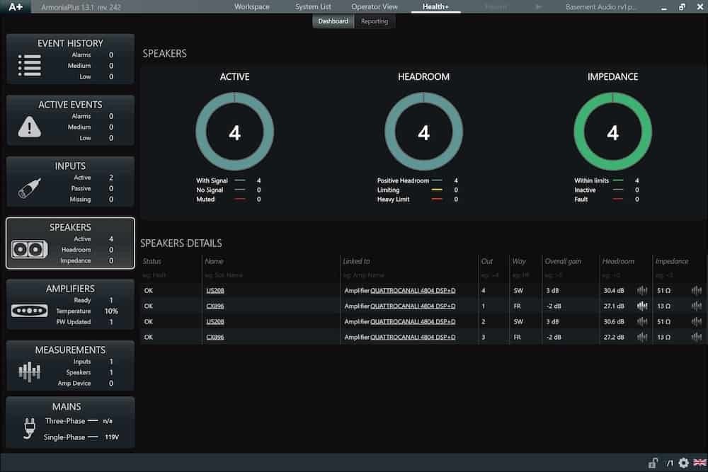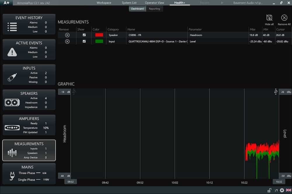 As well as monitoring power amplifiers, speakers and other connected devices, the system can also provide insights into the overall health of the system, measuring factors like headroom, temperature, voltage and impedance. It will even alert operators if elements malfunction.HealthPlus also comes with an Event History tool, where users can track uploaded programmes, logins and get an overview of any long-term system issues. In addition to this, it also features an improved reporting system, enabling engineers to track multiple indicators over time, for more detailed system monitoring.