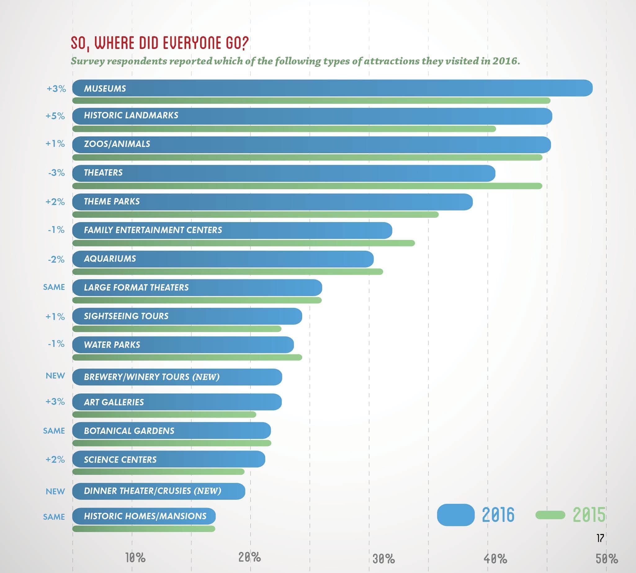 Aquariums have the highest projected attendance growth in 2017 of 4.4%, while Zoo/Animal Attractions also promises one of the highest growth rates at 2.9%. Zoo/Animal Attractions also have one of the highest intents to return to the same one in 2017 at 4.3 (on a five-point scale). If considering local partnerships, 2016 Aquarium guests are most likely to also visit Zoo/Animal Attractions and Historic Landmarks in 2017, while Zoo/Animal Attraction guests are most likely to also visit Museums and Historic Landmarks.