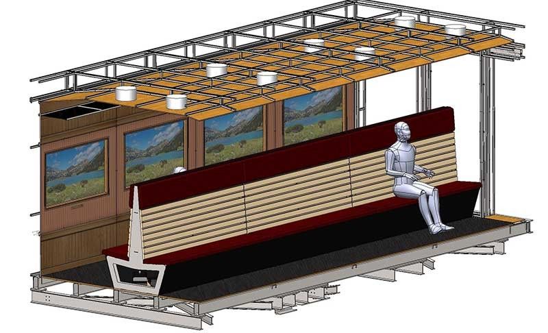 The Volcan'Express comprises of two 24-seat train wagons on a 3-DOF pneumatic dynamic platform. For total immersion, the windows of the wagons will actually be 4K screens (eight per wagon, four on each side). These will relay a trip in the Puy-de-Dôme along the Lemptégy volcano.During their trip, passengers will witness many events including the awakening of the volcano. The synchronisation between the screens coupled with effects including heat, wind, smoke and vibration will provide a breathtaking experience.