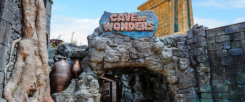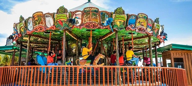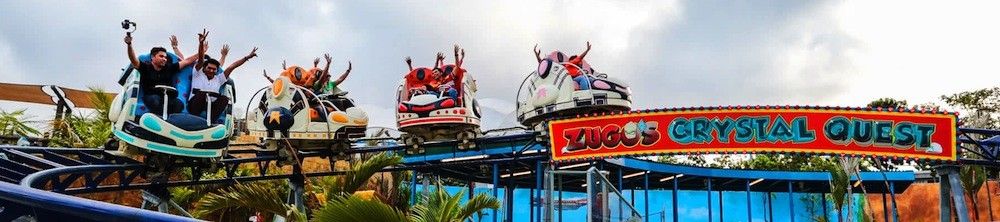 • Fantasy Forest Zone. Kids' area including Zugo's Crystal Quest (SBF-Visa spinning coaster, pictured above)), Upside Down Pyramid, The Adventurers HQ Tree House, Red Baron, Fantasy Carousel, Coral Kingdom (themed restaurant/play area), Coliseum Water Play and Cave of Wonders (walk-through attraction).