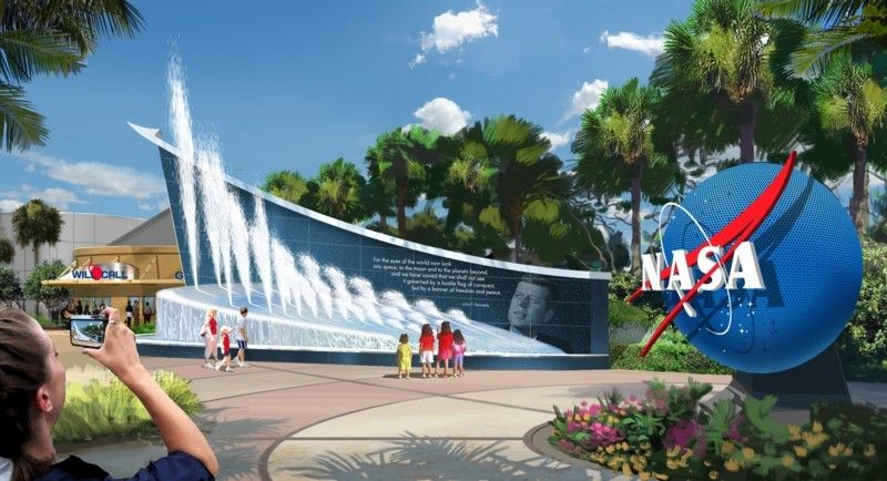 Working in tandem with Kennedy Space Center Visitor Complex operators Delaware North Companies Parks & Resorts, PGAV Destinations’ design incorporates numerous thrilling elements into the entry experience. The strongest of which is the complete redirection of foot-traffic entering and exiting Kennedy Space Center: guests are now directed through the Rocket Garden, dwarfed by the towering powerhouses of Titan, Redstone, Atlas, and Saturn 1B rockets that propelled capsules into space. Combined with these brand-new intriguing elements is the theme of “explore, ” interwoven throughout the design imagery of the entry experience – melding with Kennedy Space Center Visitor Complex’s over-arching brand. Among many elements is a fountain show themed to a space shuttle launch, an 18-foot glass model of Mars, a pathway constructed of the same Tennessee river rock which the “crawler” moves along to carry rockets from the Vehicle Assembly Building to the launch pad, and an entire themed lay-out that evokes the lift-off of space shuttles.
