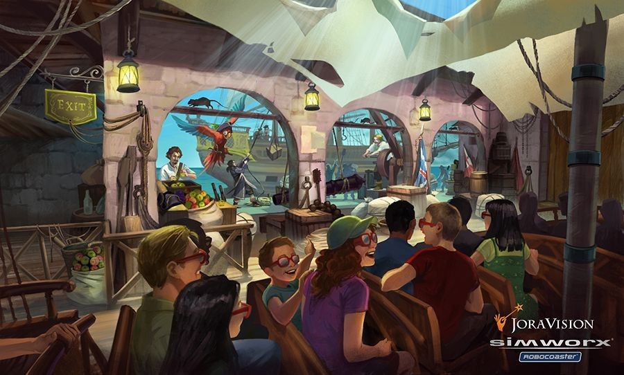 Simworx have utilised their expertise in the technical elements of the ride including the 3DOF seats in the galleon, the galleon track, 3D projection onto curved screens, 2D projection screens, the water basin around the ride, audio visual content and hardware, show control throughout the attraction and wind effects.Meanwhile JoraVision provided concept design, theming and décor production design, art direction of the movie and audio content and vehicle theming.
