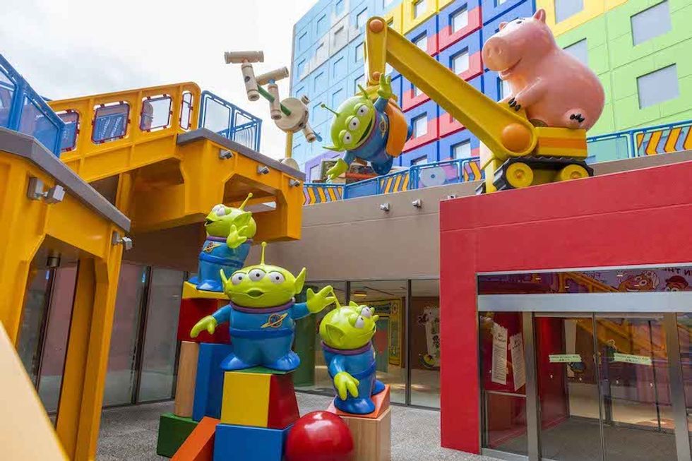 Slinky Dog Park, located in the front plaza area of the hotel, features oversized Jessie and Buzz Lightyear toys on an enormous Slinky Dog board game. Gift Planet, a retail outlet managed by Little Green Men, sells exclusive merchandise.