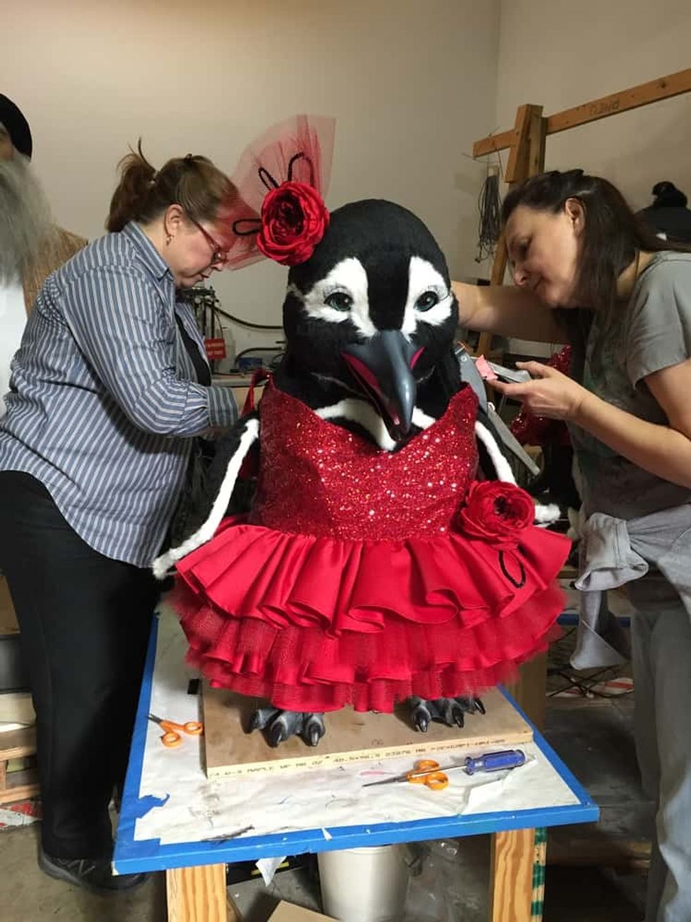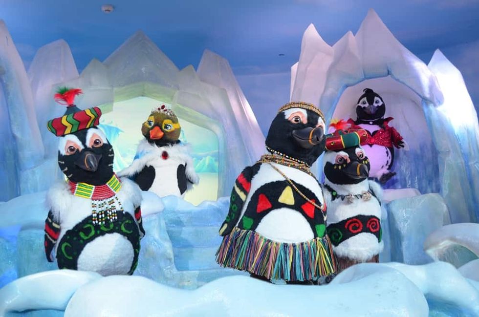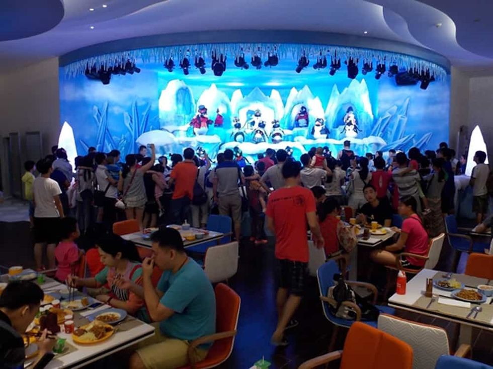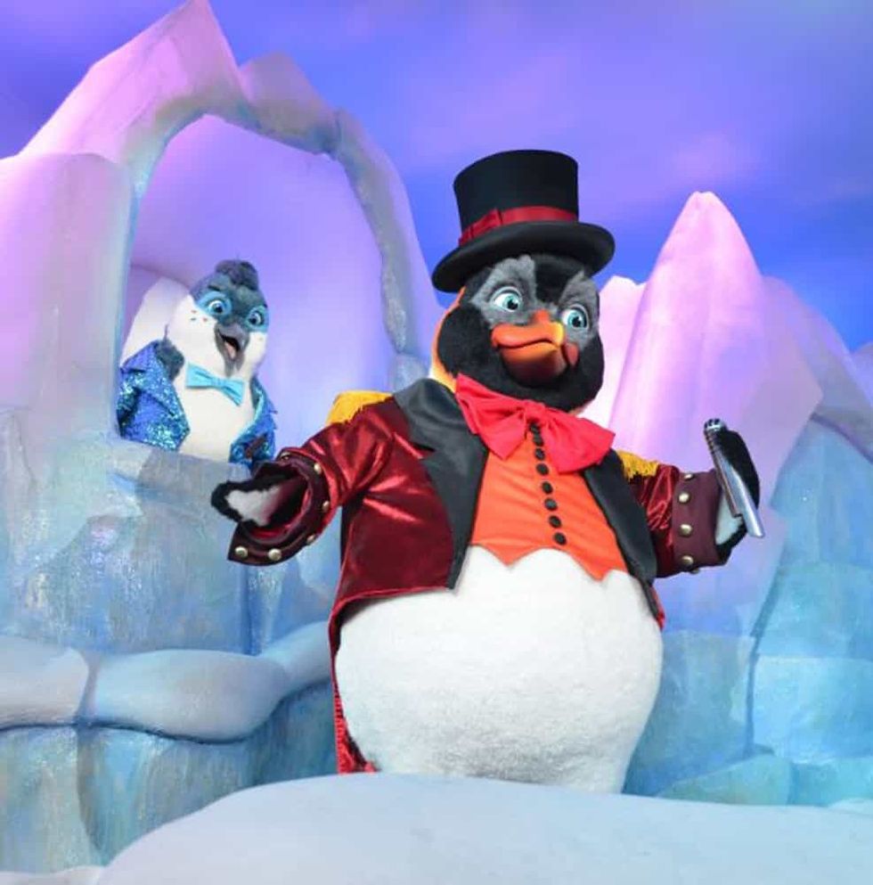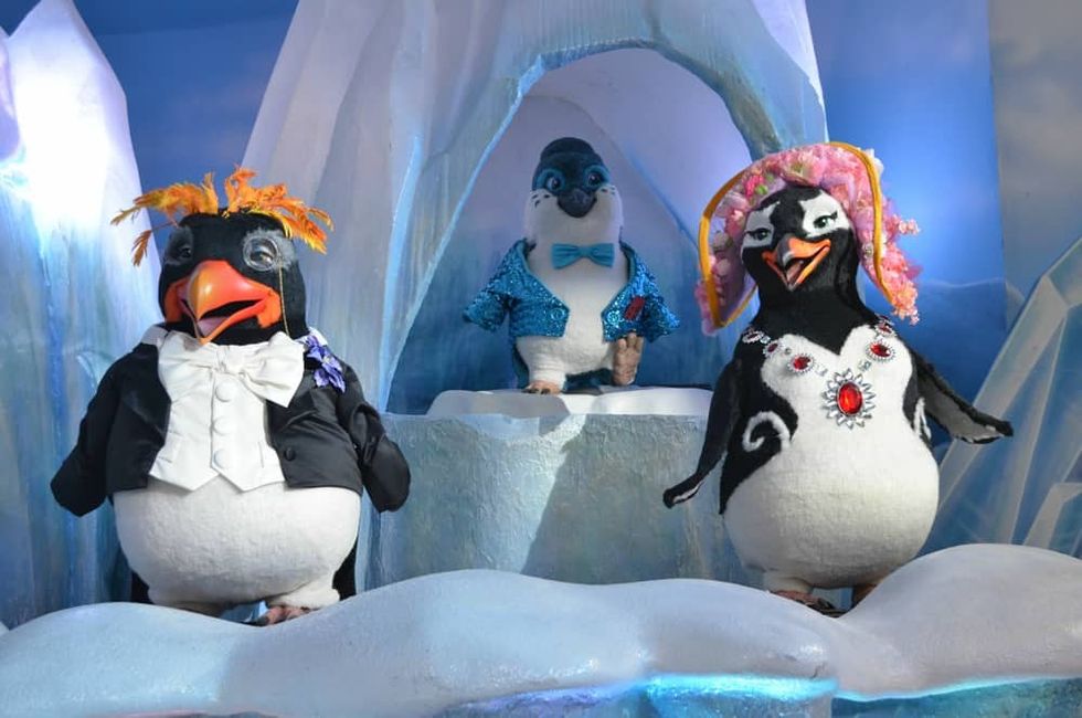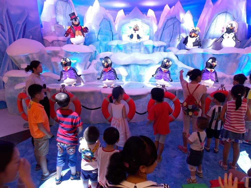 "Penguins On Parade" is an animated musical show featuring 16 animatronic penguins designed and built by Sally Dark Rides for Chimelong's Penguin Hotel Restaurant, located in Guangzhou, China.