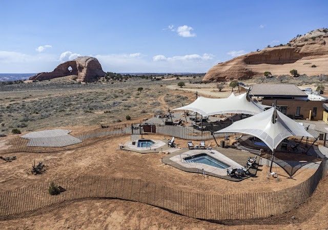 In addition, the resort provides yoga lessons with a view of the stunning red rock landscape. ULUM Moab offers luxurious lodgings in a remote desert location with views of Canyonlands National Park, surrounded by stunning scenery, and only a short distance from Looking Glass Arch.
