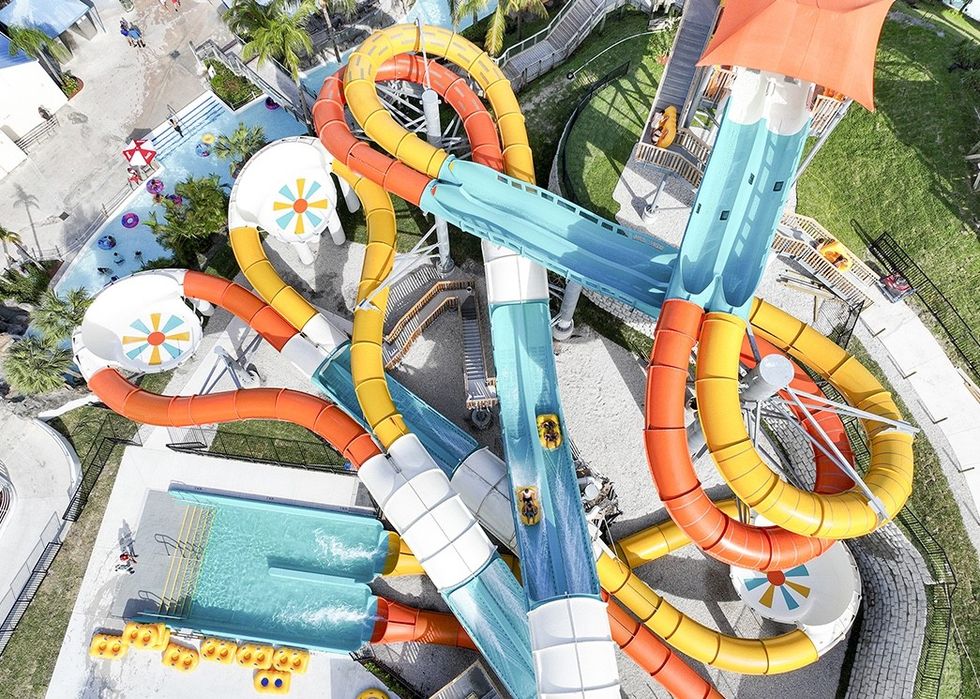 First, I will give an honorable mention to a unique class of waterslides that are always on the move. I’m talking about some impressive new waterslides added to cruise ships launching this year. This notable list includes the launch of the Utopia of the Seas in July, which features three impressive slides: Cyclone, Supercell and Typhoon. The Carnival Jubilee also launched this season, featuring a small collection of three waterslides and a small water play area for the kids.