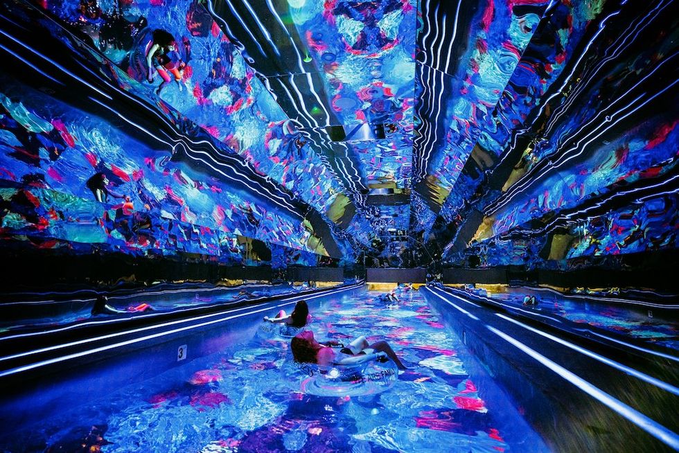 A new indoor water park has been created at Futuroscope in France, with three immersive indoor areas, 13 waterslides, and an outdoor area. It features several unique takes on the water park experience. Many of the attractions incorporate various lighting, audio, and special projection effects to create a unique atmosphere and disorient the sliders in unique new ways.